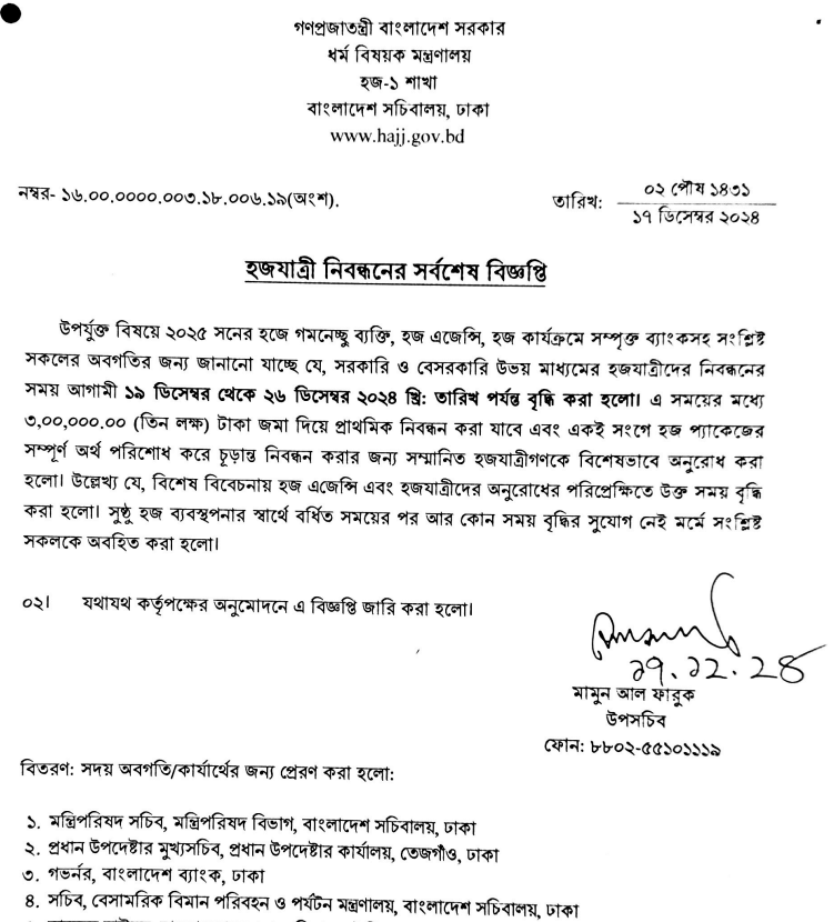 ২০২৫ সনের হজযাত্রী নিবন্ধনের সর্বশেষ বিজ্ঞপ্তি